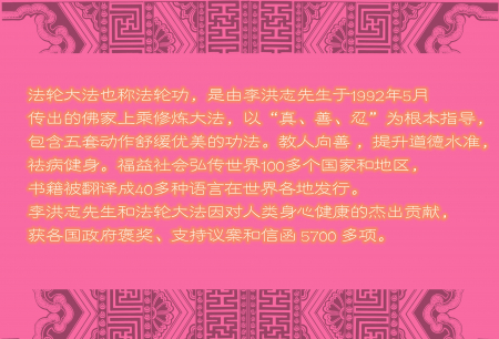 Pháp Luân Đại Pháp, còn được gọi là Pháp Luân Công, là một môn tu luyện Phật gia được Đại sư Lý Hồng Chí phổ truyền ở Trung Quốc vào tháng 05 năm 1992, lấy “Chân – Thiện – Nhẫn” làm chỉ đạo căn bản, bao gồm năm bài công pháp khoan thai đẹp mắt, dạy con người hướng thiện, đề cao tiêu chuẩn đạo đức, chữa bệnh khỏe người, mang lại lợi ích cho xã hội. Pháp Luân Đại Pháp đã được phổ biến đến hơn 100 quốc gia và khu vực trên toàn thế giới. Các sách của môn tu luyện này đã được dịch sang 40 ngôn ngữ và phát hành trên toàn cầu. Ngài Lý Hồng Chí và Pháp Luân Đại Pháp đã nhận được hơn 5.700 giải thưởng, nghị quyết ủng hộ và thư khen ngợi từ các chính phủ trên khắp thế giới vì những cống hiến to lớn cho sức khỏe thể chất và tinh thần của con người.