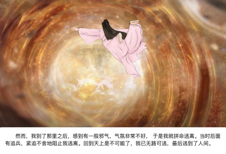 Tuy nhiên, sau khi đến nơi, tôi cảm thấy nơi đó có một luồng tà khí, bầu không khí vô cùng bất hảo, tôi liền liều mạng bỏ trốn. Lúc ấy đám quân binh truy đuổi theo sát tôi, ráo riết truy bắt không cho tôi thoát. Trở về thiên giới là điều không thể, tôi đã không còn lối thoát, cuối cùng đành trốn tới nhân gian.