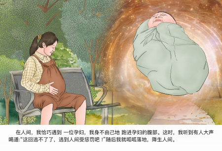 Tôi đến nhân gian vừa đúng lúc gặp được một phụ nữ đang mang thai, trong lúc không còn lựa chọn nào khác, tôi đã chạy vào bụng của thai phụ kia. Khi đó, tôi nghe có người lớn tiếng quát: “Lần này thì trốn không được nữa đâu, ngươi tới nhân gian mà chịu trừng phạt đi!” Thế rồi, tôi cất tiếng khóc oa oa chào đời, giáng sinh nơi trần thế.