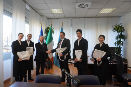 Sáng ngày 13/02/2026, cựu Thứ trưởng nước Ý, Thị trưởng thành phố Segni, ông Silvano Moffa (thứ hai từ trái sang), cùng điều phối viên đảng phái kiêm Giám đốc AGENS, ông Fabrizio Molina (thứ ba từ trái sang), đồng hành với Nghị viên thành phố Rome, ông Federico Rocca (thứ nhất từ trái sang), đã tiếp đón các nghệ sĩ Shen Yun tại Cung điện Vùng Lazio. (Ảnh: Leo Botnarenko/The Epoch Times)