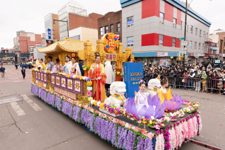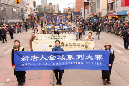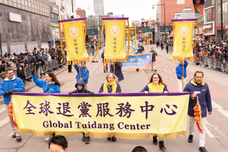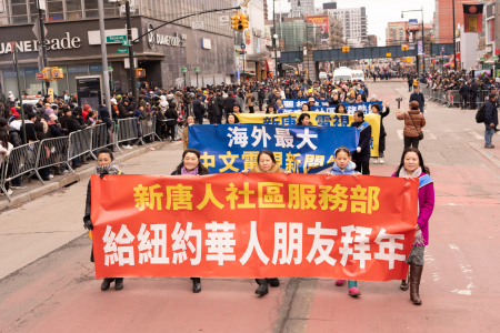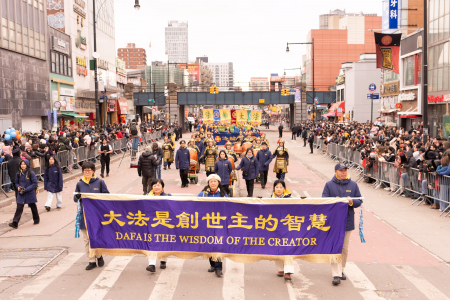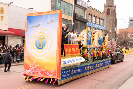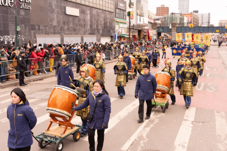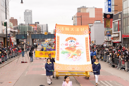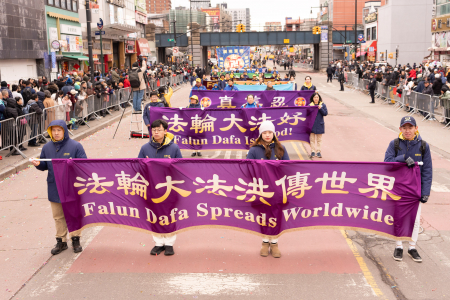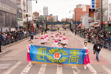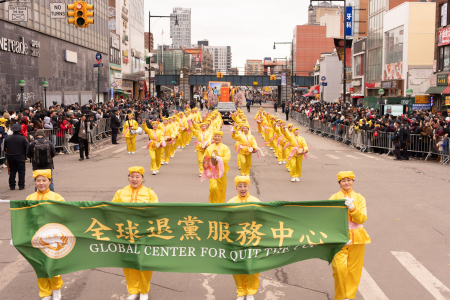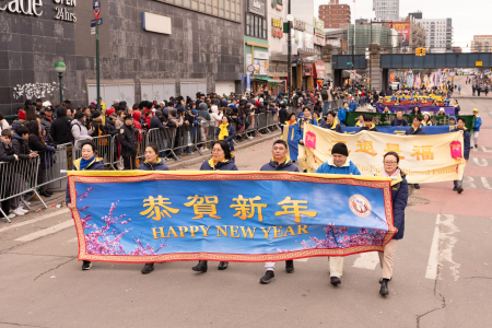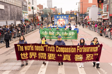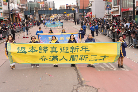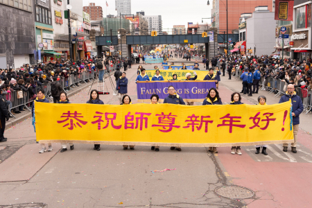 Các học viên Pháp Luân Công cũng tham gia đại diễu hành mừng năm mới của người Hoa được tổ chức thường niên tại Flushing, bao gồm Đoàn nhạc Thiên Quốc, Tập đoàn Truyền thông The Epoch Times – NTD, Trung tâm Dịch vụ Thoái Đảng Toàn cầu (Tuidang)… Đoàn diễu hành có khí thế hùng hậu, hoành tráng và nổi bật, được người xem chào đón nồng nhiệt; người dân đứng xem dọc đường liên tục dùng điện thoại chụp ảnh, quay video.
