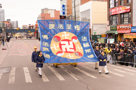 Ngày 21/02/2026, tức mùng 5 Tết Bính Ngọ, các học viên Pháp Luân Công đã tham gia hoạt động đại diễu hành mừng Tết Nguyên đán của người Hoa được tổ chức thường niên tại Flushing — khu vực có cộng đồng người Hoa đông nhất thành phố New York. (Ảnh: Đới Binh/The Epoch Times)
