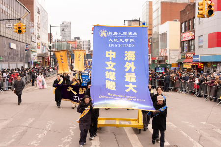 Ngày 21/02/2026, tức mùng 5 Tết Bính Ngọ, Thời báo The Epoch Times và Đài Truyền hình NTDTV đã tham gia hoạt động đại diễu hành mừng Tết Nguyên đán của người Hoa được tổ chức thường niên tại Flushing — nơi có cộng đồng người Hoa đông nhất thành phố New York. (Ảnh: Đới Binh/The Epoch Times)