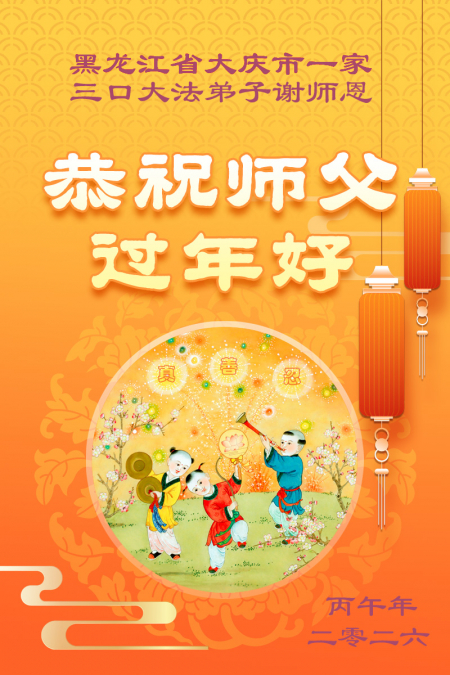 Kính chúc Sư phụ năm mới vui vẻ! Cả gia đình chúng con được tắm mình trong hồng ân của Đại Pháp. Cảm tạ Đại Pháp, cảm ân Sư phụ! Cảm ân Sư phụ từ bi khổ độ! Cảm ân Đại Pháp bảo hộ chúng con trên suốt chặng đường! Đệ tử và người nhà mang theo lòng kính ngưỡng, lòng cảm ân kính chúc Sư tôn năm mới vui vẻ! Chúng con xin được khấu bái Sư phụ!