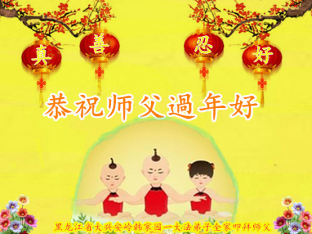 Toàn thể gia đình một đệ tử Đại Pháp cùng ba tiểu đệ tử ở thị trấn nhỏ Đông Bắc, tỉnh Hắc Long Giang kính chúc Sư phụ từ bi vĩ đại năm mới vui vẻ!