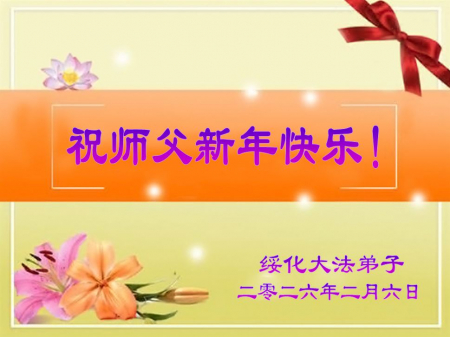 Kính chúc Sư phụ năm mới vui vẻ! Là một đệ tử Đại Pháp là lựa chọn không bao giờ hối hận của con, được làm đệ tử của Sư phụ là niềm vinh diệu của con. Con xin cảm ân Sư tôn từ bi bảo hộ! Từ nay về sau đệ tử sẽ luôn đối chiếu Đại Pháp, quy chính từng tư từng niệm từng hành động, tu khứ những quan niệm chấp trước vẫn còn, trân quý thời gian tu luyện Chính Pháp còn lại không nhiều này, không hổ thẹn sứ mệnh, viên mãn theo Sư phụ về!