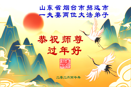 Hai đệ tử Đại Pháp lâu năm tại thành phố Chiêu Viễn, Yên Đài, Sơn Đông kính chúc Sư phụ từ bi vĩ đại năm mới vui vẻ!
