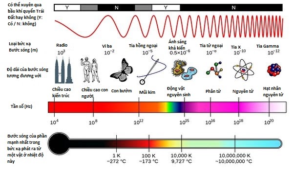 Phổ sóng điện từ. Nguồn: Nl74, Inductiveload, NASATranslated by Tonys (talk) – File:EM Spectrum Properties edit.svg, CC BY-SA 3.0, (Ảnh: commons.wikimedia)