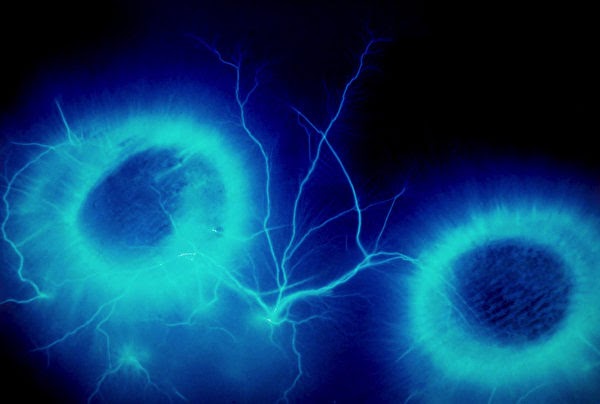 Khi hai người yêu nhau, các trường năng lượng phát ra từ đầu ngón tay sẽ giao hòa với nhau. Trường năng lượng của họ tỏa ra ánh sáng như tia chớp, liên kết lại một chỗ. (Ảnh do ông Konstantin Korotkov cung cấp)