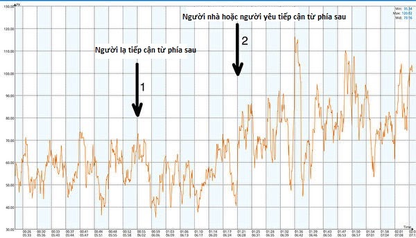 Khi người lạ đến gần từ phía sau, trường năng lượng của đối tượng thử nghiệm không thay đổi; khi người nhà hoặc người yêu đến gần từ phía sau, trường năng lượng của đối tượng thử nghiệm lập tức tăng lên. (Ảnh do ông Konstantin Korotkov cung cấp)