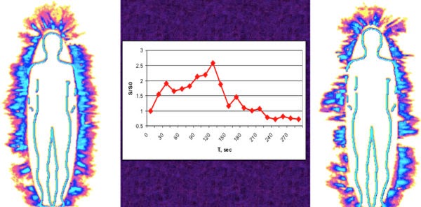 Hơn 200 năm nghiên cứu lý sinh hiện đại từ cuối thế kỷ 18 đến nay đã cho thấy rằng, cơ thể con người có thể phát ra các hạt electron và photon, tạo ra ánh sáng mà mắt thường không thể nhìn thấy được. Khi cơ thể con người ở trong trường điện từ, sự phát xạ của các hạt này có thể chụp lại được. Đây là bằng chứng rất xác thực về trường năng lượng của cơ thể con người.