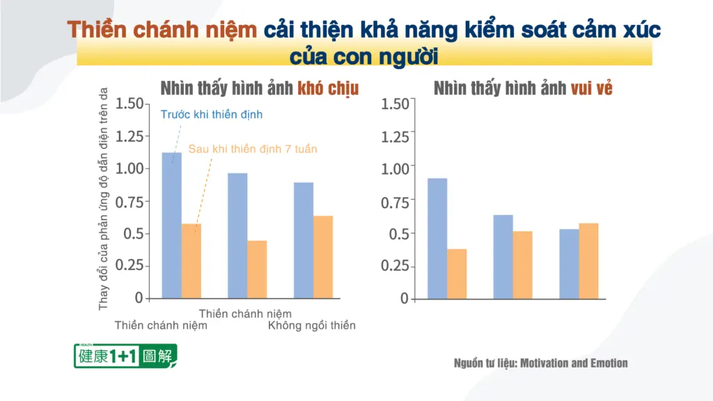 Sau bảy tuần ngồi thiền trong nhóm thiền chánh niệm, cho dù là nhìn thấy những bức ảnh khó chịu hay dễ chịu, biên độ thay đổi trong phản ứng độ dẫn điện tối đa của da (SCR, một chỉ số phản ứng cảm xúc) của họ đều đã giảm đáng kể. Điều này phản ánh rằng sau khi con người thiền định, khả năng kiểm soát cảm xúc của họ đã tăng lên, cảm xúc của họ không dễ bị thay đổi bởi những hình ảnh đó. “Bất dĩ vật hỉ, bất dĩ kỷ bi” (không vui vì vẻ đẹp của những thứ bên ngoài, cũng không buồn vì sự thất vọng và sa sút của bản thân), những xung kích thông thường đối với tình cảm không thể lay động được trái tim của họ.