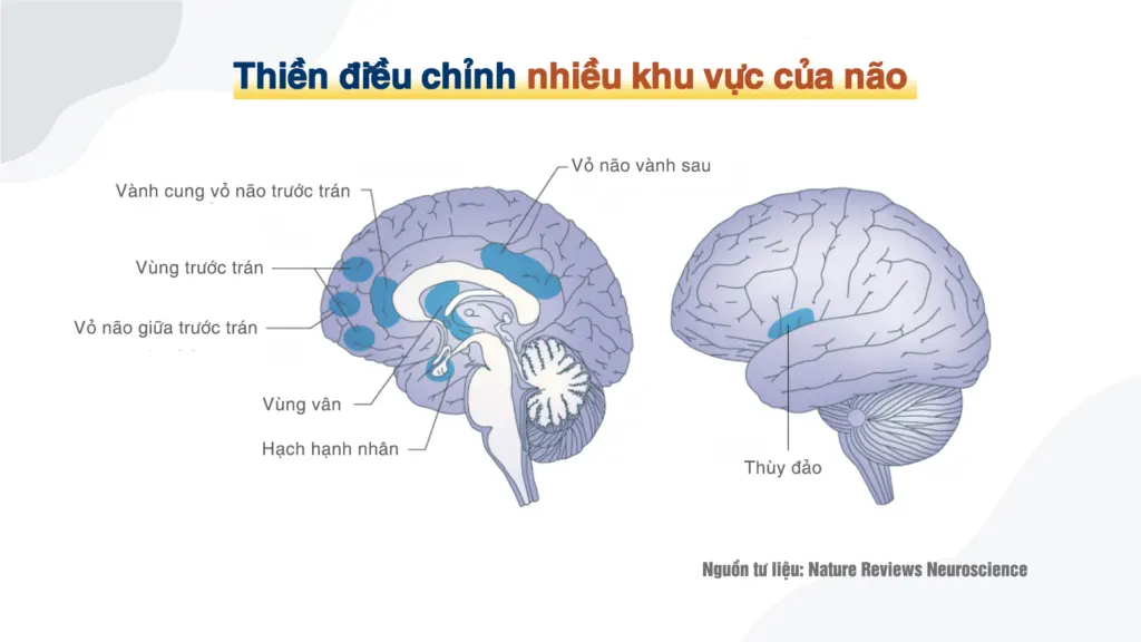 Năm 2015, nhà thần kinh học Đường Nhất Nguyên (Tang Yiyuan) tại Đại học Công nghệ Texas cùng đồng sự đã đề cập trong một bài báo đăng trên tạp chí Nature Reviews Neuroscience rằng, họ phát hiện thiền chánh niệm có tác dụng điều chỉnh có lợi trên nhiều vùng của não, bao gồm vành cung vỏ não trước trán (anterior cingulate cortex) và vùng vân (striatum) liên quan đến kiểm soát sự chú ý; nhiều vùng trước trán (multiple prefrontal regions), hệ thống limbic (limbic system, bao gồm cả amygdala: hạch hạnh nhân) và vùng vân liên quan đến điều hòa cảm xúc; thùy đảo (insula), vỏ não giữa trước trán (medial prefrontal cortex), vỏ não vành sau (posterior cingulate cortex) và vùng Precuneus liên quan đến khả năng tự nhận thức. [380]