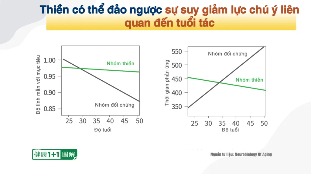 Nghiên cứu còn phát hiện khi tuổi tác tăng lên, lực chú ý của nhóm đối chứng sẽ giảm đi, thời gian phản ứng của họ cũng tăng lên, trong khi lực chú ý của nhóm thiền vẫn không thay đổi.
