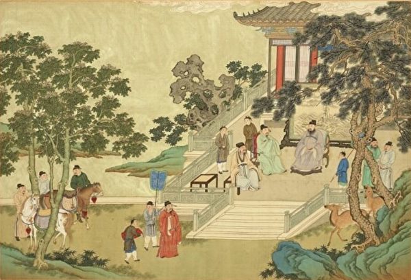 Hán Vũ Đế thường triển khai thảo luận quyết sách hòa hay đánh với Hung Nô trên triều đình. Trong hình là một phần bức tranh “Phúc thọ tề thiên sách. Gia hựu tứ chân”, không rõ tác giả. (Ảnh thuộc sở hữu cộng đồng).