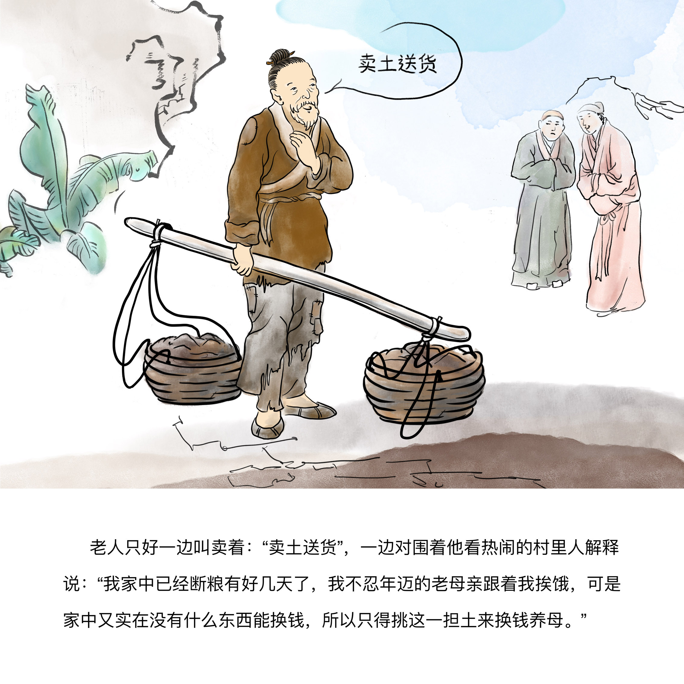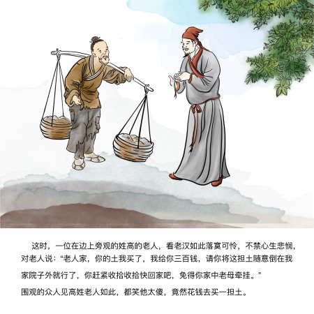 Ông lão nhìn anh ta rồi nói: “Gánh đất của tôi nhìn thì thấy bình thường, nhưng đất này có đức dày có thể nâng đỡ vạn vật, có thể cứu người trong đại nạn. Các vị ai có lòng tốt giúp tôi với, thương xót người mẹ già ở nhà tôi mà mua lấy gánh đất này đi”.