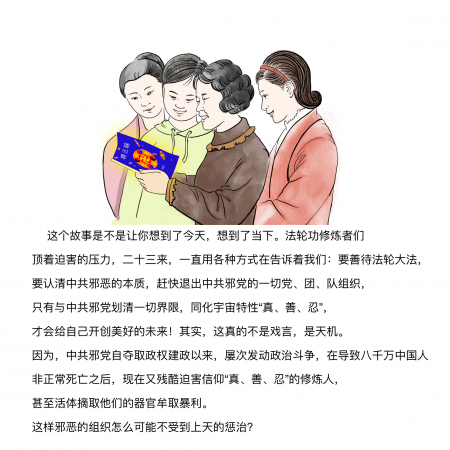 Câu chuyện cổ này có khiến chúng ta liên tưởng tới ngày hôm nay không? Trước áp lực bị bức hại suốt 23 năm qua, người tu luyện Pháp Luân Công vẫn không ngừng dùng mọi cách để nói với chúng ta: Hãy dùng thiện tâm để đối đãi với Pháp Luân Đại Pháp, hãy nhận thức ra bản chất xấu xa của ĐCSTQ đồng thời giữ vững nguyên lý Chân-Thiện-Nhẫn trong tâm, bạn mới có thể khai sáng một tương lai tốt đẹp cho bản thân mình. Kỳ thực đây không phải là chuyện đùa, mà chính là thiên cơ.