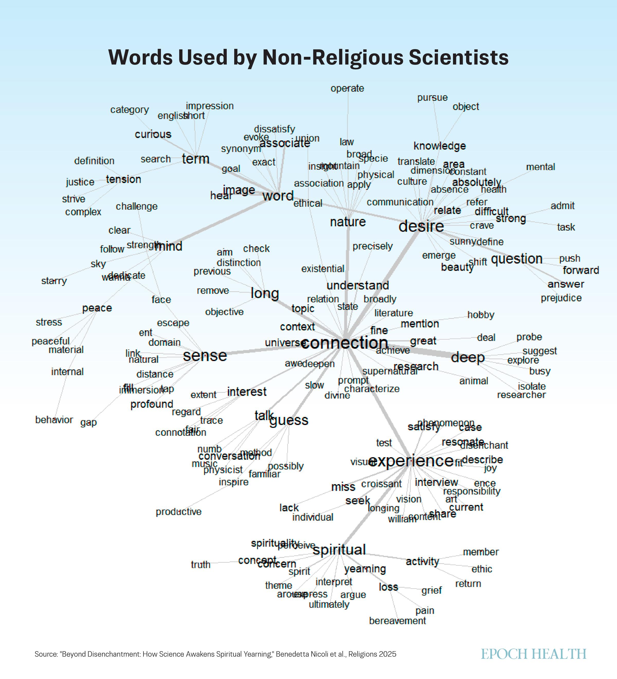Các nhà khoa học không tôn giáo và không tâm linh có vẻ như miễn nhiễm với trải nghiệm tâm linh, nhưng ông Vaidyanathan nhận thấy rằng họ thường bộc lộ những khát khao tương tự thông qua sự tò mò trí tuệ và thắc mắc về nhân sinh. Họ định hình việc theo đuổi ý nghĩa dưới góc độ phát triển cá nhân và kết nối với thiên nhiên hoặc vũ trụ. Các cụm từ của họ nhấn mạnh vào “trí tò mò”, “ý nghĩa”, và “sự kết nối”. Một nhà khoa học mô tả đó là “động lực để tiếp tục đặt câu hỏi”.