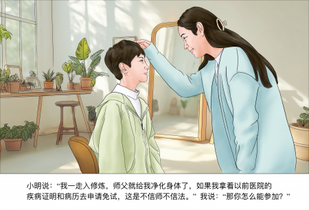 Tiểu Minh nói: “Ngay khi con bước vào tu luyện, Sư phụ đã tịnh hóa thân thể cho con. Nếu bây giờ con cầm chứng nhận bệnh tật và hồ sơ bệnh án trước đây của mình để xin được miễn thi, chẳng phải đó là con không tin vào Sư phụ và Đại Pháp hay sao”.