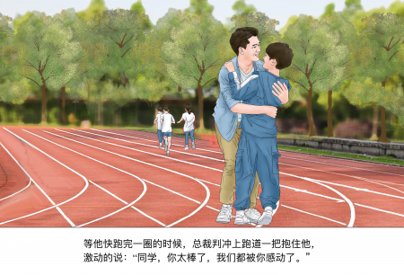 Khi cháu sắp chạy xong một vòng, trọng tài chính vội lao vào đường chạy ôm lấy Tiểu Minh và xúc động nói: “Cậu bé, em thật tuyệt vời, chúng tôi đều bị em làm cảm động rồi!”.