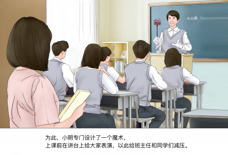 Vì vậy, Tiểu Minh đã đặc biệt chuẩn bị một màn ảo thuật, trước giờ lên lớp, cháu đã biểu diễn trước cả lớp để cô chủ nhiệm và các bạn học giảm bớt áp lực.