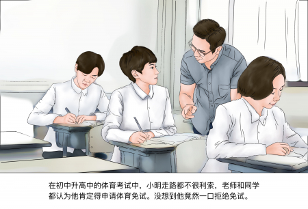Trong kỳ thi chuyển cấp từ cấp hai lên cấp ba môn thể dục, Tiểu Minh đi còn chưa được vững, các thầy cô và bạn học đều cho rằng cháu nhất định phải xin miễn thi. Không ngờ Tiểu Minh vẫn nhất quyết từ chối việc miễn thi.